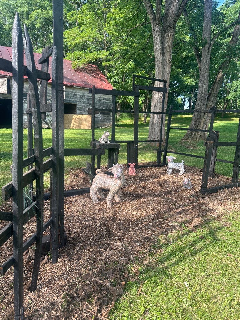 Site-specific installation Animal Farm by Dasha Bazanova is a satirical allegory constructed from charred wooden structures and populated by ceramic animals embodying extreme personality traits and deep internal conflict, spiraling into madness.The scorched materials allude to the residue of past decisions–once stable foundations now reduced to ash. Animal Farm invites viewers to confront uncomfortable truths about human nature, societal dynamics, and the fragile structures we build—only to watch them burn.