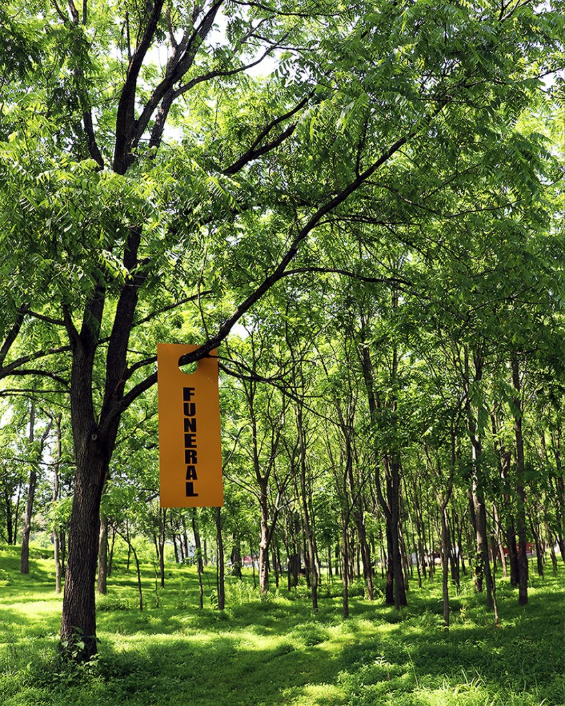 Inhumation presents a monumental funeral procession tag, objects placed on a car rearview mirror during the procession from the funeral home to the cemetery. The oddly minimalist mobile towers over viewers and the word “FUNERAL” presents the essence of the object and ritual, defamiliarizing and abstracting how we memorialize and grieve. Hanging the object in a tree comments on death being an essential element of nature; it is as natural as birth, change, and adaptation.