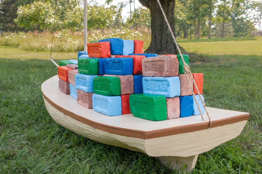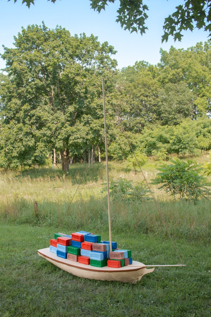 Cargo, Both Ways anachronistically combines a 19th-century sloop with the aesthetics of intermodal shipping containers, connecting the early industrialization of the Hudson Valley to contemporary globalization. Containing real Hudson Valley bricks that were reclaimed from demolished New York City buildings, the work is also a journey home for materials dug from the earth one hundred years ago.